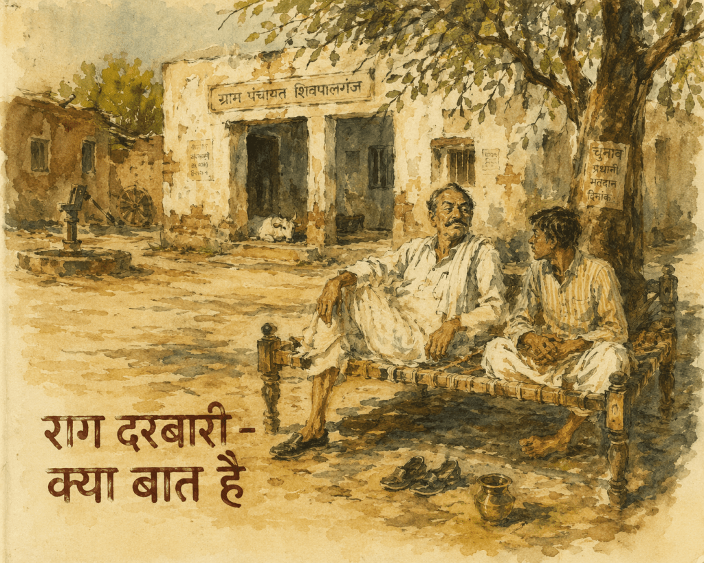 यह उपन्यास स्वतंत्र भारत के एक काल्पनिक गाँव शिवपालगंज की कहानी है — लेकिन काल्पनिक कहते हुए भी हाथ रुकता है। रंगनाथ शहर से आता है, पढ़ा-लिखा है, आँखें खुली हैं। और वैद्यजी — उसके मामा — उस गाँव की असली सत्ता हैं। दोनों के बीच का रिश्ता, दोनों के बीच की दूरी, यही इस उपन्यास की धुरी है।